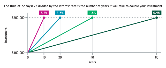 The rule of 72 is a simple approximation of how long it will take for an investment to double in value. The rule states that you can estimate the number of years it will take if you divide 72 by the annual interest rate. For example, if you have an investment with a fixed rate of 7.2% it will take approximately 10 years for the investment to double because 72 divided by 7.2 is 10, whereas, at 3.6% (half of 7.2%), it takes twice as long because 72 divided by 3.6 is 20, and so on.